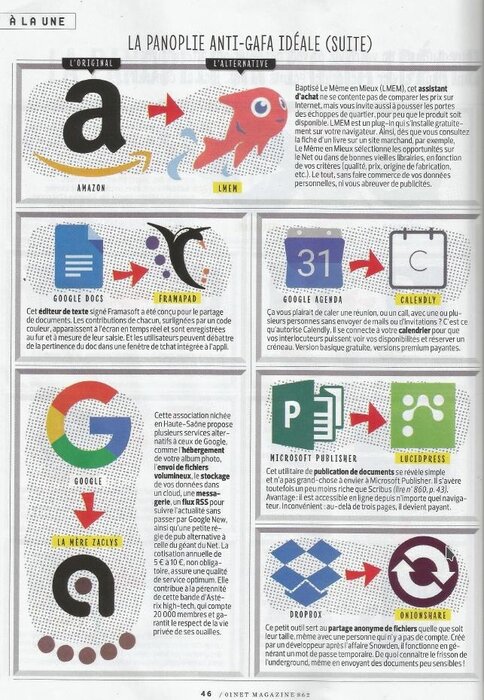 Ca se passe en page 46 du magazine d'avril 2017, l'article a pour titre "la panoplie anti-GAFA idéale". Zaclys y est visiblement montré comme une alternative crédible à certains services connus. Merci à 01Net :-)