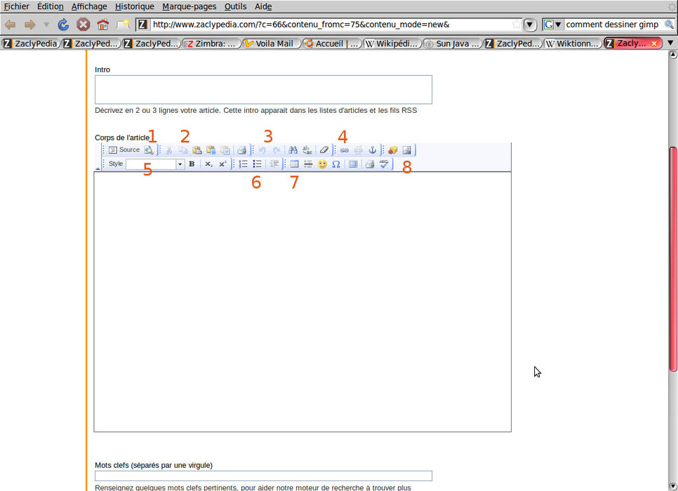 Pour rédiger le corps de l'article, une zone de saisie est disponible. Voici les options les plus fréquemment utilisées.