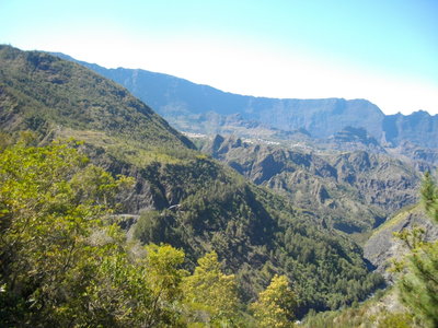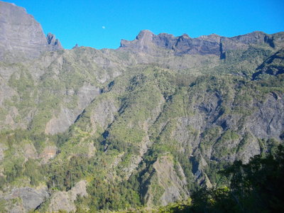 TOUR DU PITON DES NEIGES, 2ème ETAPE : LA ROCHE MERVEILLEUSE (Cilaos) - MARLA (Mafate) : 5 h 30 de marche, 1055 m  , 860 m - ; P3, T1 (très court passage T2). Météo : beau temps. Participant : Marcel., Le col du Taïbit en haut à gauche : il est encore à près de 4 h de marche.13/10/2014 08h59Le col du Taïbit en haut à gauche : il est encore à près de 4 h de marche.