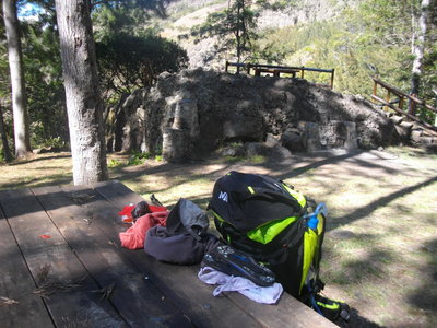 TOUR DU PITON DES NEIGES, 2ème ETAPE : LA ROCHE MERVEILLEUSE (Cilaos) - MARLA (Mafate) : 5 h 30 de marche, 1055 m  , 860 m - ; P3, T1 (très court passage T2). Météo : beau temps. Participant : Marcel., Mon bivouac à Marla, juste à côté de l'école13/10/2014 16h33Mon bivouac à Marla, juste à côté de l'école