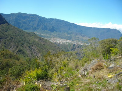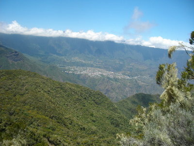 TOUR DU PITON DES NEIGES, 2ème ETAPE : LA ROCHE MERVEILLEUSE (Cilaos) - MARLA (Mafate) : 5 h 30 de marche, 1055 m  , 860 m - ; P3, T1 (très court passage T2). Météo : beau temps. Participant : Marcel., Dernière vue de Cialos avant de franchir le col13/10/2014 13h19Dernière vue de Cialos avant de franchir le col