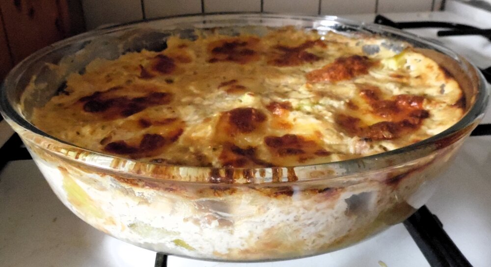 Verser par-dessus le mélange béchamel, thon, moutarde…